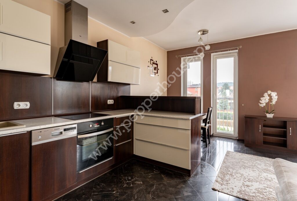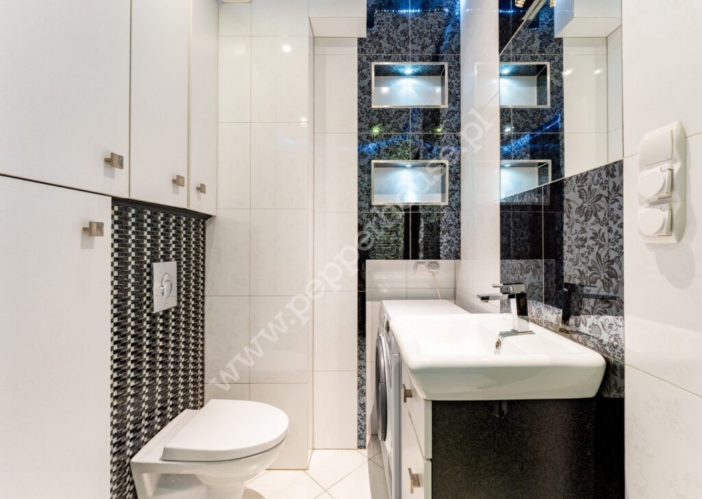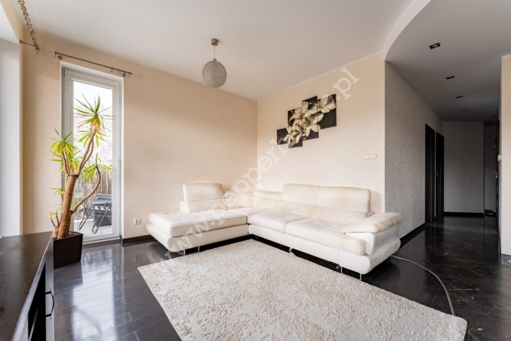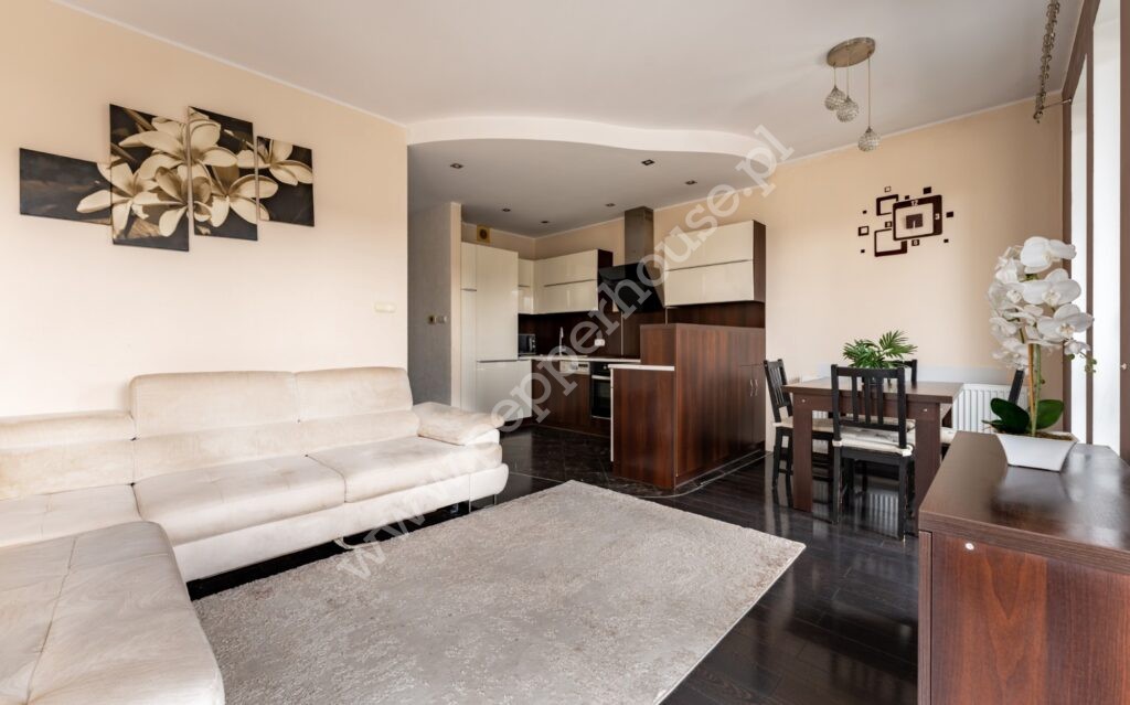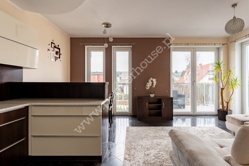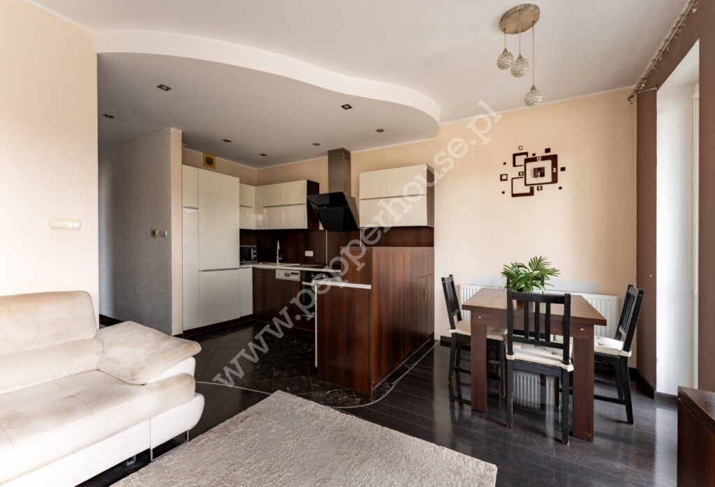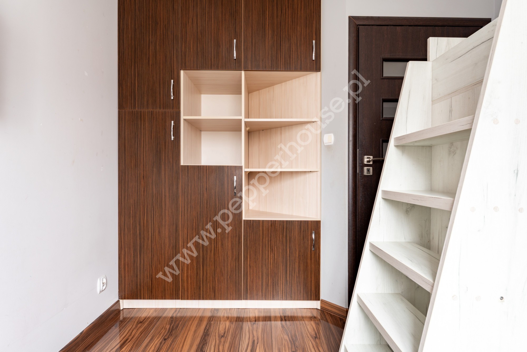 Wnętrze zostało wykończone w standardzie umożliwiającym aranżację według własnych potrzeb, z wykorzystaniem zabudowy meblowej wykonanej na wymiar. Kuchnia wyposażona jest w sprzęt AGD (lodówka, zmywarka, piekarnik, płyta grzewcza, mikrofalówka). Wszystkie meble oraz wyposażenie widoczne na zdjęciach pozostają w cenie nieruchomości.