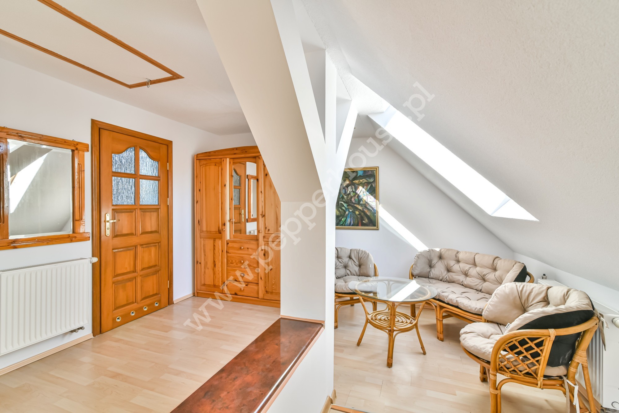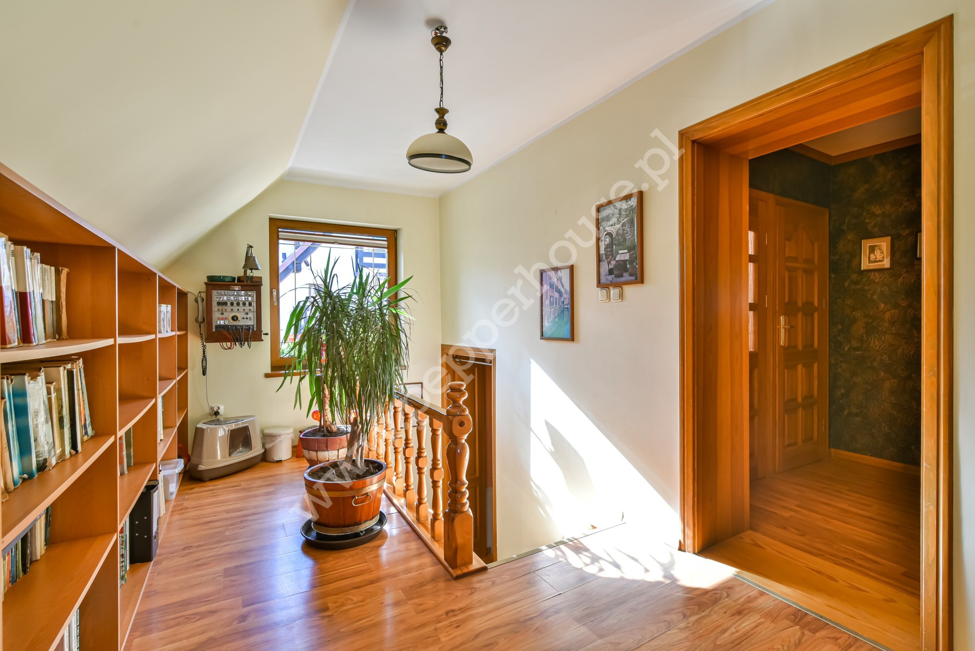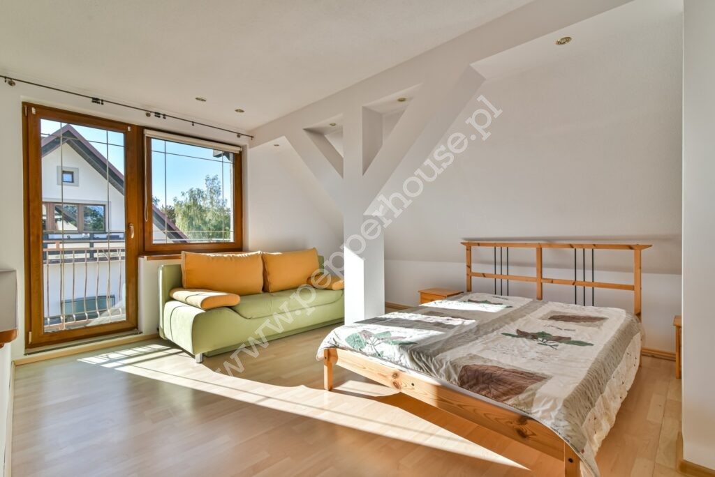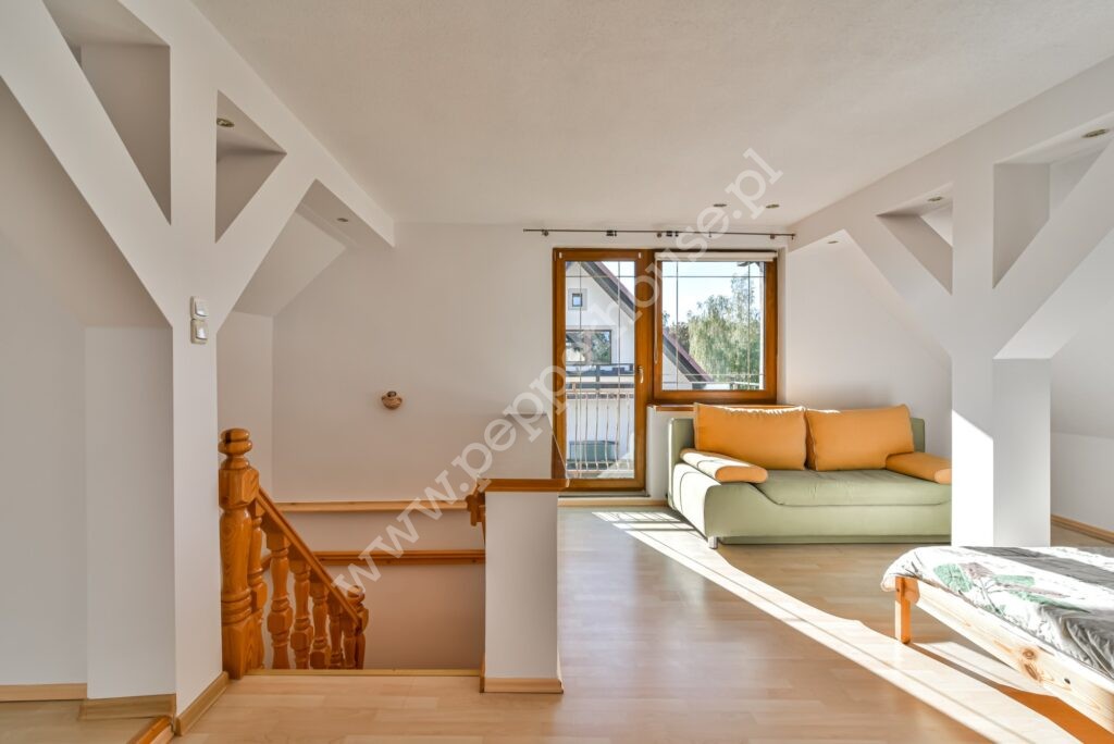 Na parterze znajduje się aneks oraz salon z wyjściem na taras i do dużego, zadbanego ogrodu. Na piętrze znajdziemy 3 przestronne pokoje, łazienkę oraz schowek, na poddaszu znajduje się przestronny pokój z łazienką i balkonem, jest tu także wyjście na strych. Na poddaszu znajdują się wyprowadzenia instalacji potrzebne do montażu kuchni. Budynek posiada świadectwo charakterystyki energetycznej.