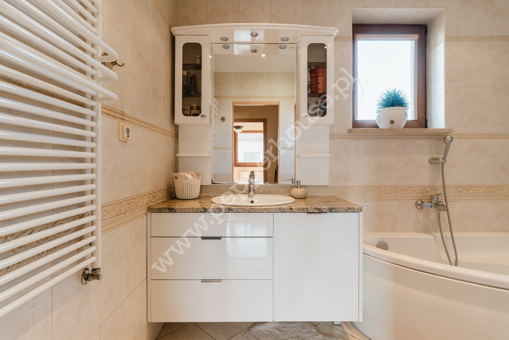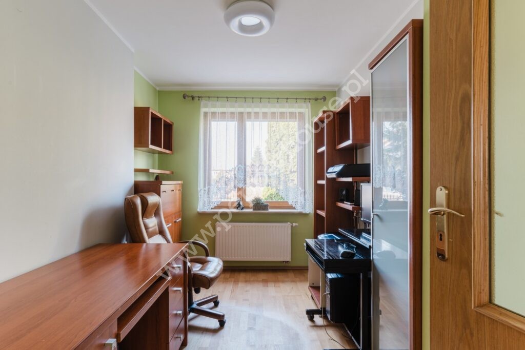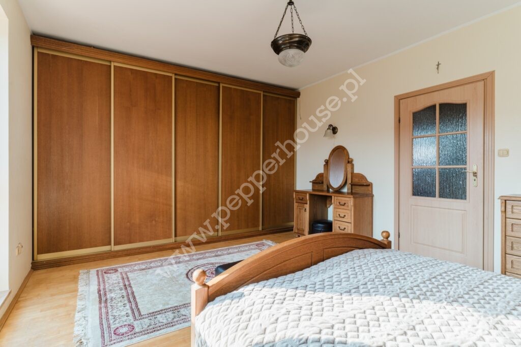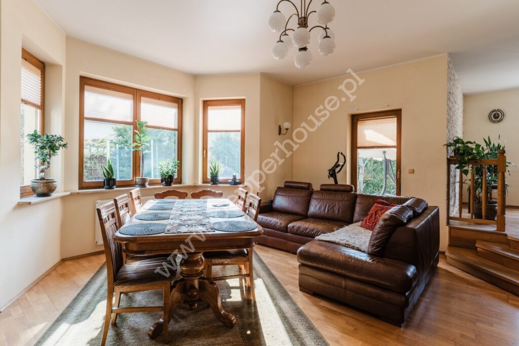 Cześć mieszkalną stanowi 5 pokoi, kuchnia z jadalnią, 2 łazienki oraz gabinet (lub garderoba)