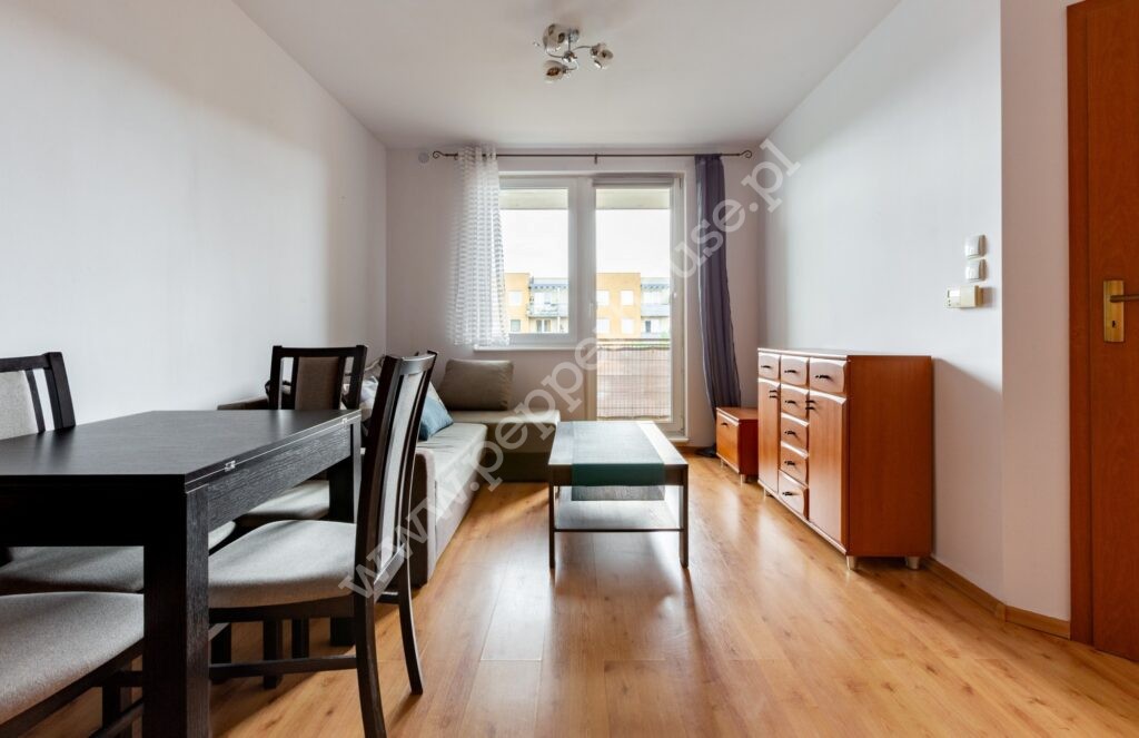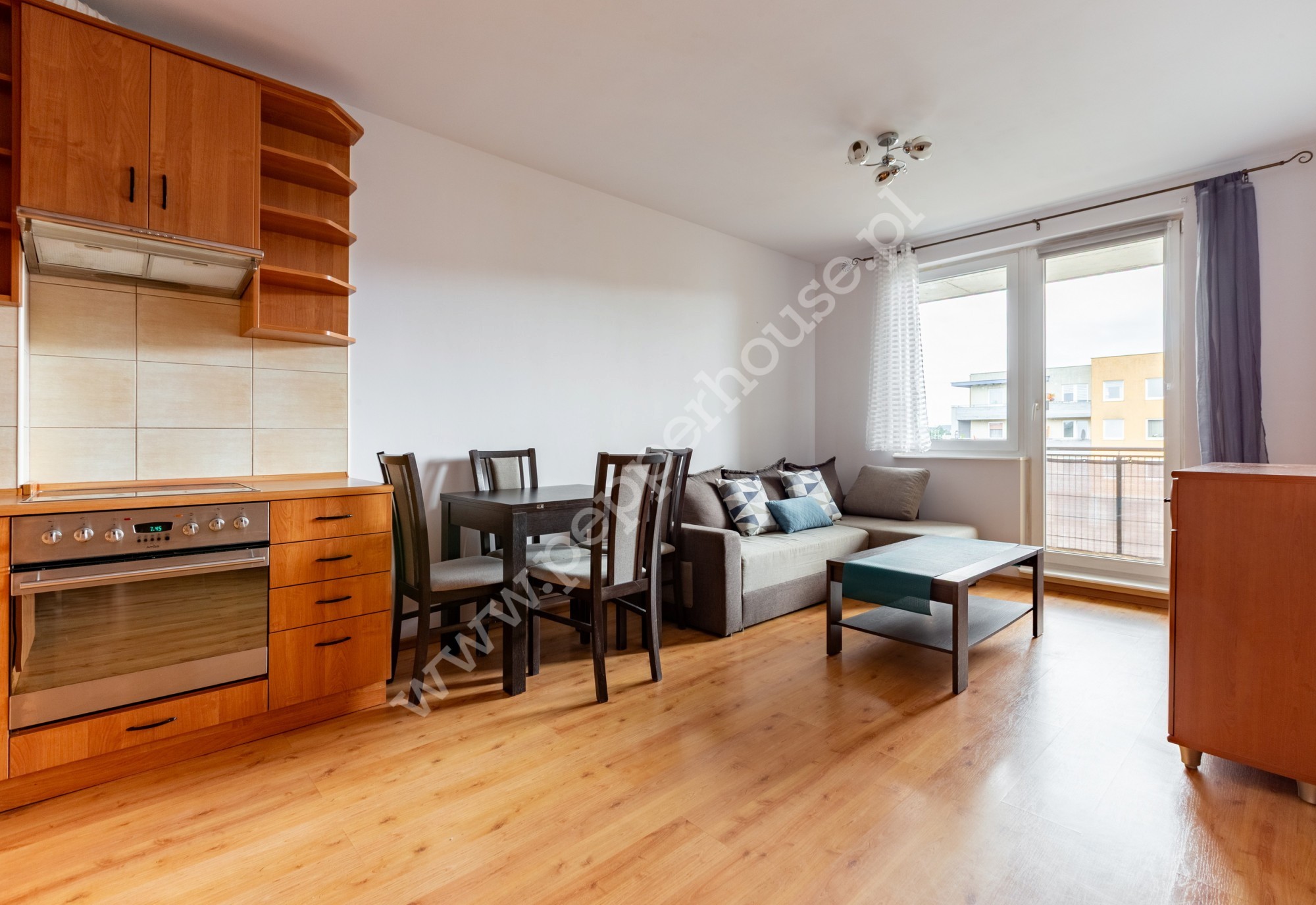 *Salon z aneksem kuchennym i wyjściem na balkon.
