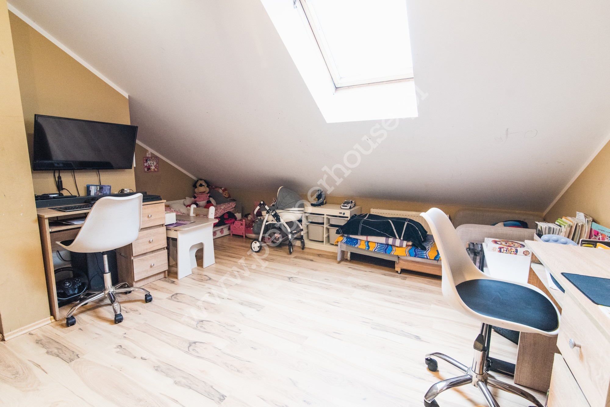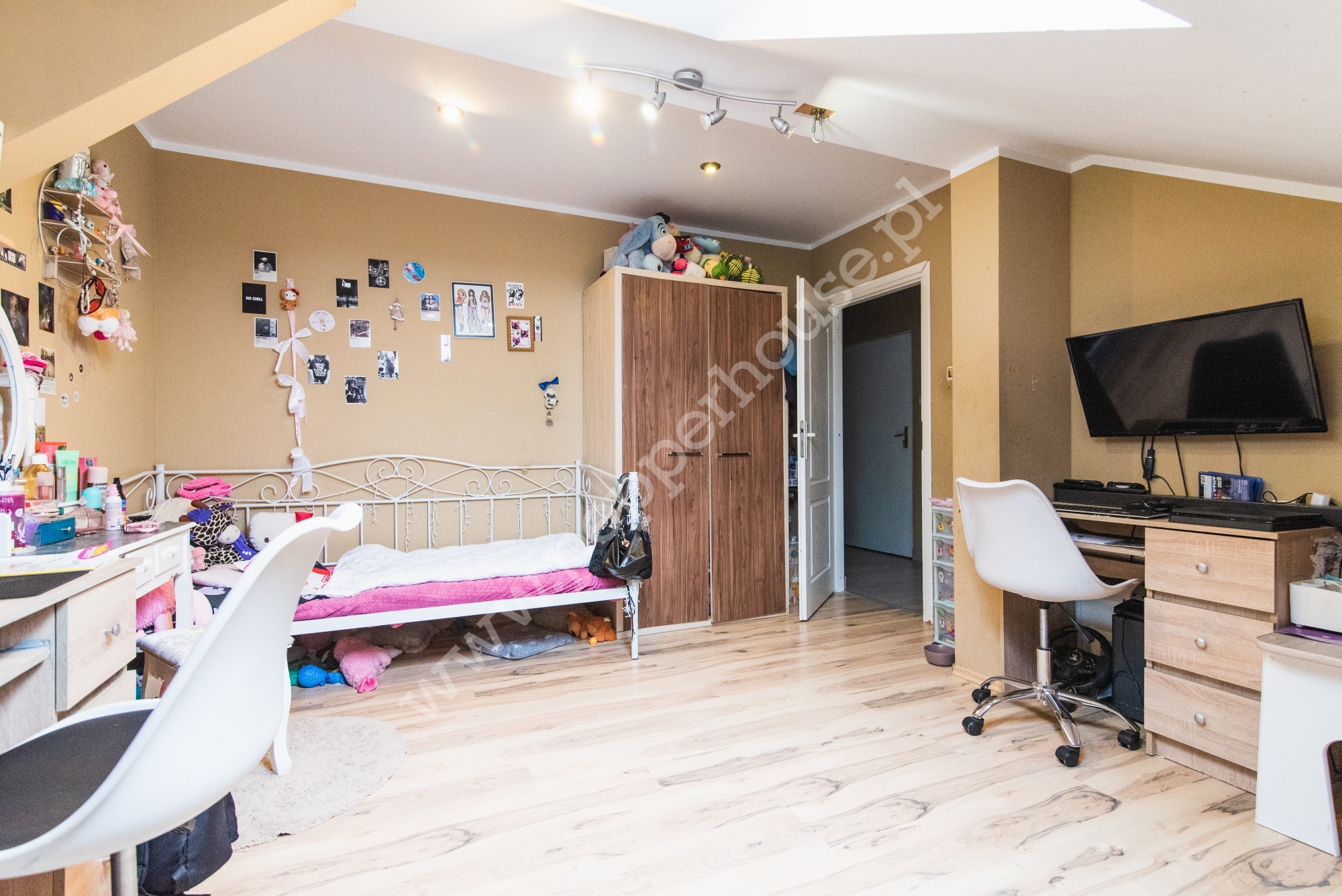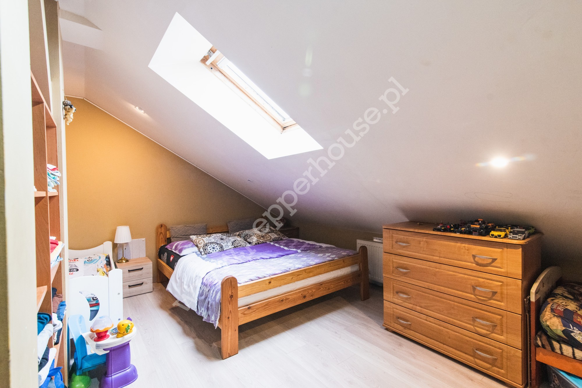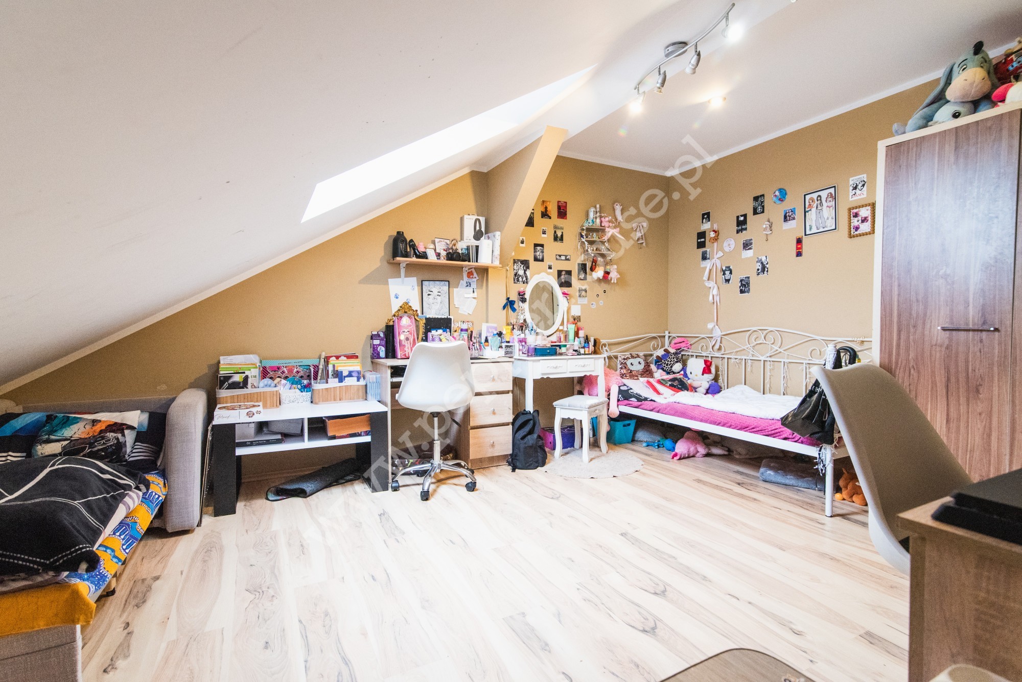 Drugi poziom to strefa prywatna, w której znajdują się dwa oddzielne pokoje, łazienka oraz garderoba. Układ ten zapewnia wygodę domownikom, prywatność oraz praktyczne miejsce do przechowywania.