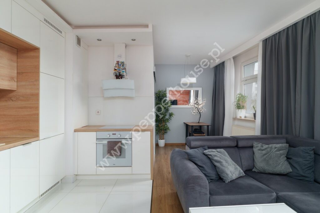 Przestronnego salonu z nowoczesnym aneksem kuchennym, tworzącego reprezentacyjny punkt mieszkania